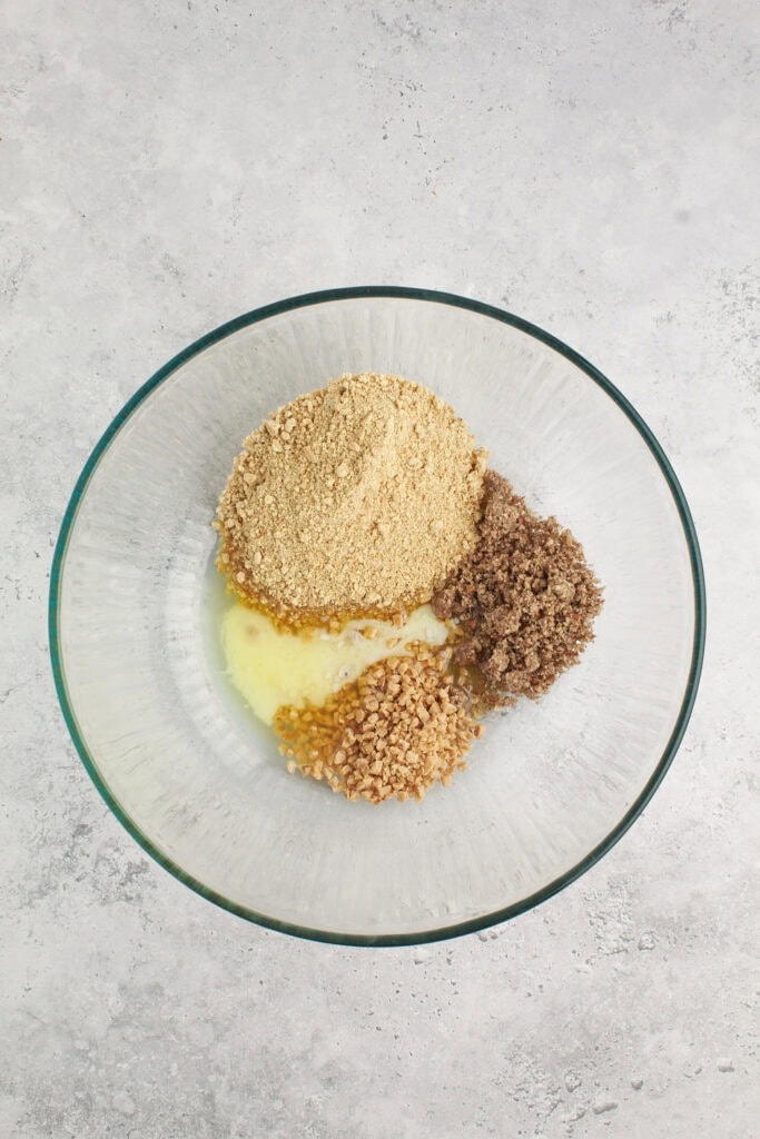 To get the crust ingredients nice and fine, I like to pulse them in a food processor. This is optional, but it makes the crust hold together nicely when you can pack it tightly.
