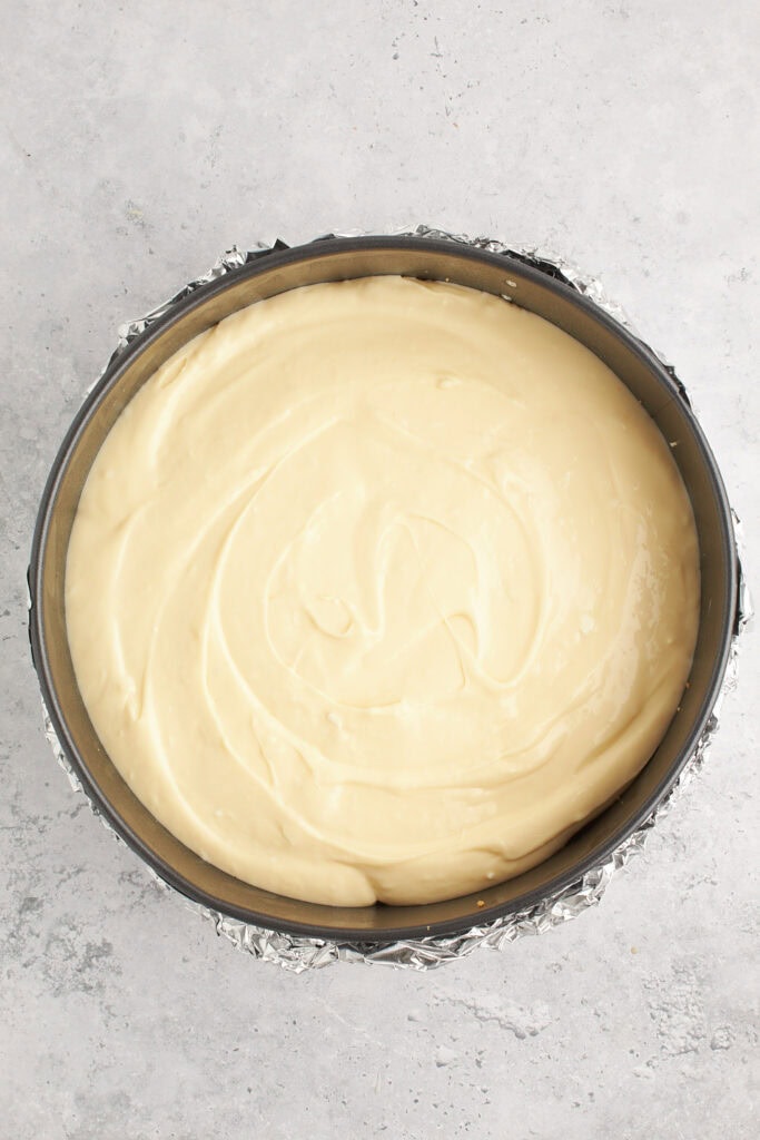 - Don’t skip the steps that keep water from seeping into your precious dessert! Wrap the pan with foil to prevent water from seeping in during baking, making sure the foil comes up well above the water level in the pan. I like to double-wrap mine!