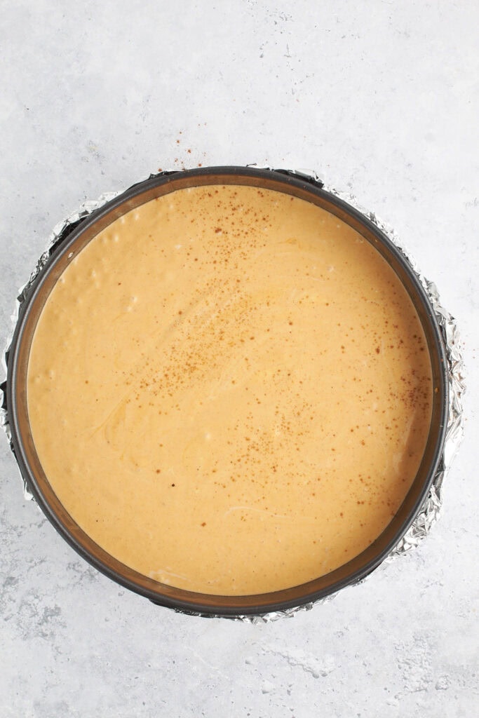 Drop the remaining 1/2 cup of reserved batter by tablespoons evenly over the pumpkin batter. Do not blend or spread out! Using the edge of a knife, create a swirl pattern in the batter. To do this, stick a butter knife vertically into the top of the cheesecake about 1/2-inch. Move the knife around in a figure-eight pattern across the top of the cheesecake until the swirls are evenly distributed. Don’t continue for too long, or you will lose those beautiful swirl designs!