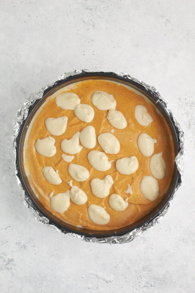 After pouring the pumpkin mixture over the base batter, drop spoonfuls of the reserved batter on top. Use a knife to gently swirl the layers together for a marbled effect.