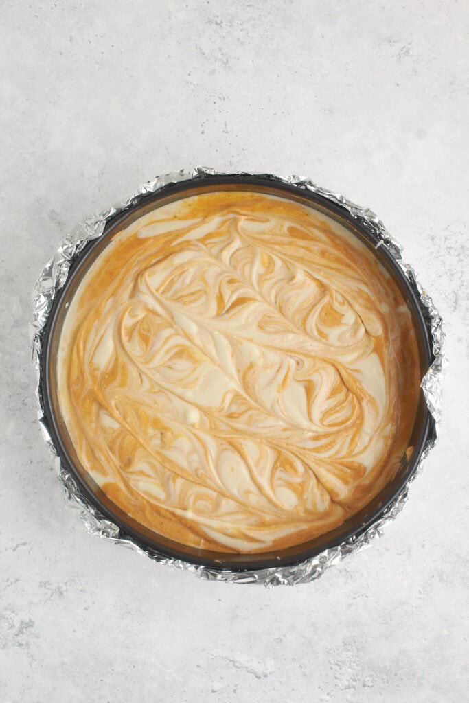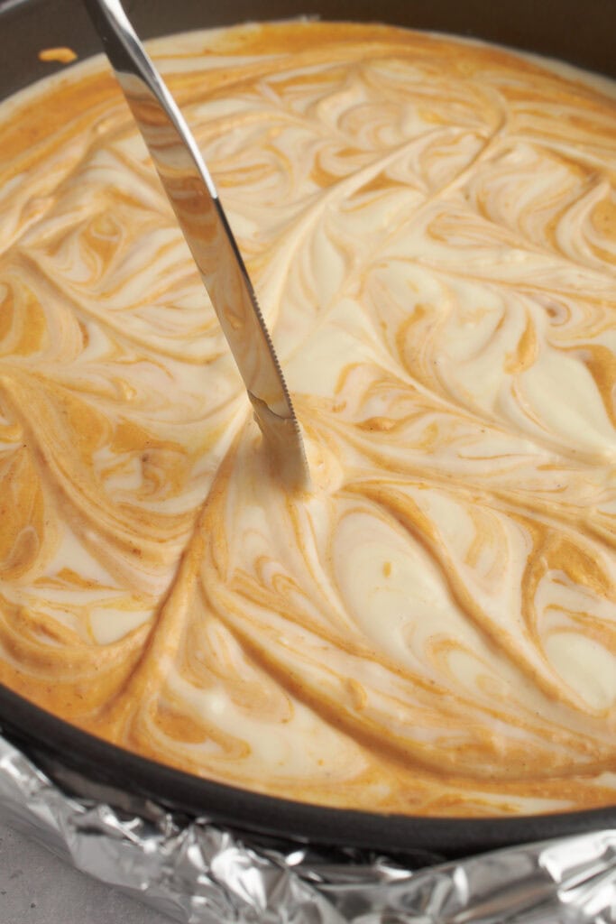 - Swirl the pumpkin mixture. This is a bit of an art, but you’ll feel so good once you nail it. Reserve part of the batter, mix it with pumpkin and spices, then pour it over the base batter in the pan. Drop spoonfuls of the remaining batter on top and swirl gently with a knife. The knife should slice vertically into the top 1/2-inch of the cheesecake. Then make figure-eight motions all across the top to get that beautiful marble effect.