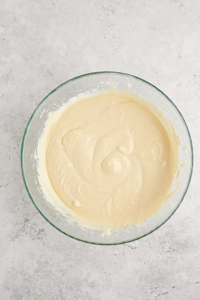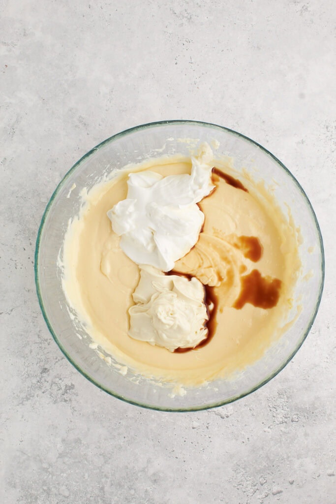 Beat the cream cheese and sugar with an electric mixer, stand mixer, or hand mixer until smooth. Gradually add eggs, one at a time, beating well after each addition, then mix in sour cream, melted white chocolate, and vanilla until fully combined.