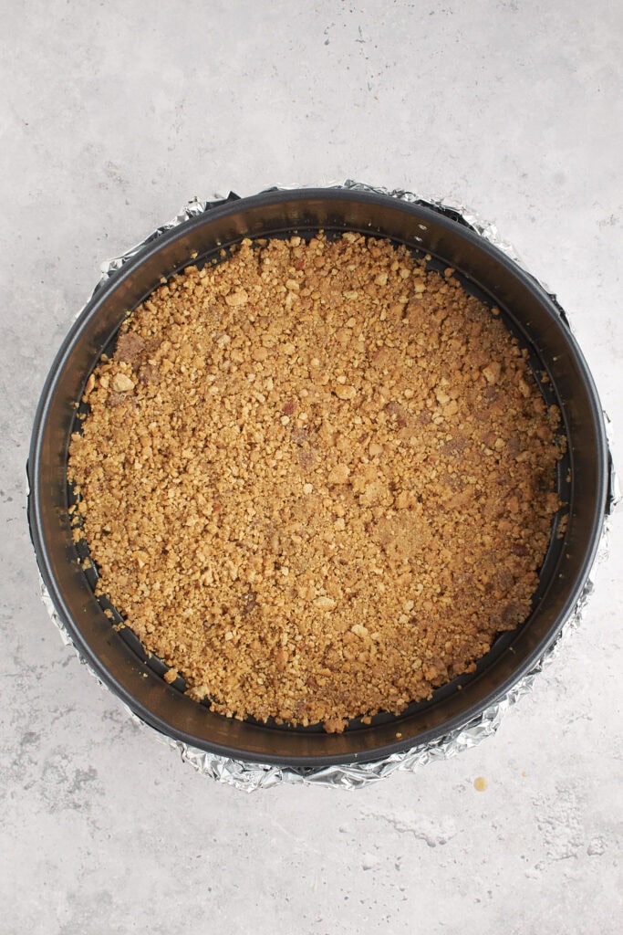 - Create a solid crust. Combine graham cracker crumbs, pecans, toffee bits, and melted butter, then press this mixture firmly into the bottom of the prepared pan to form a solid crust. To get it nice and firm, use the back of a measuring cup to press down all across the surface of the crust.